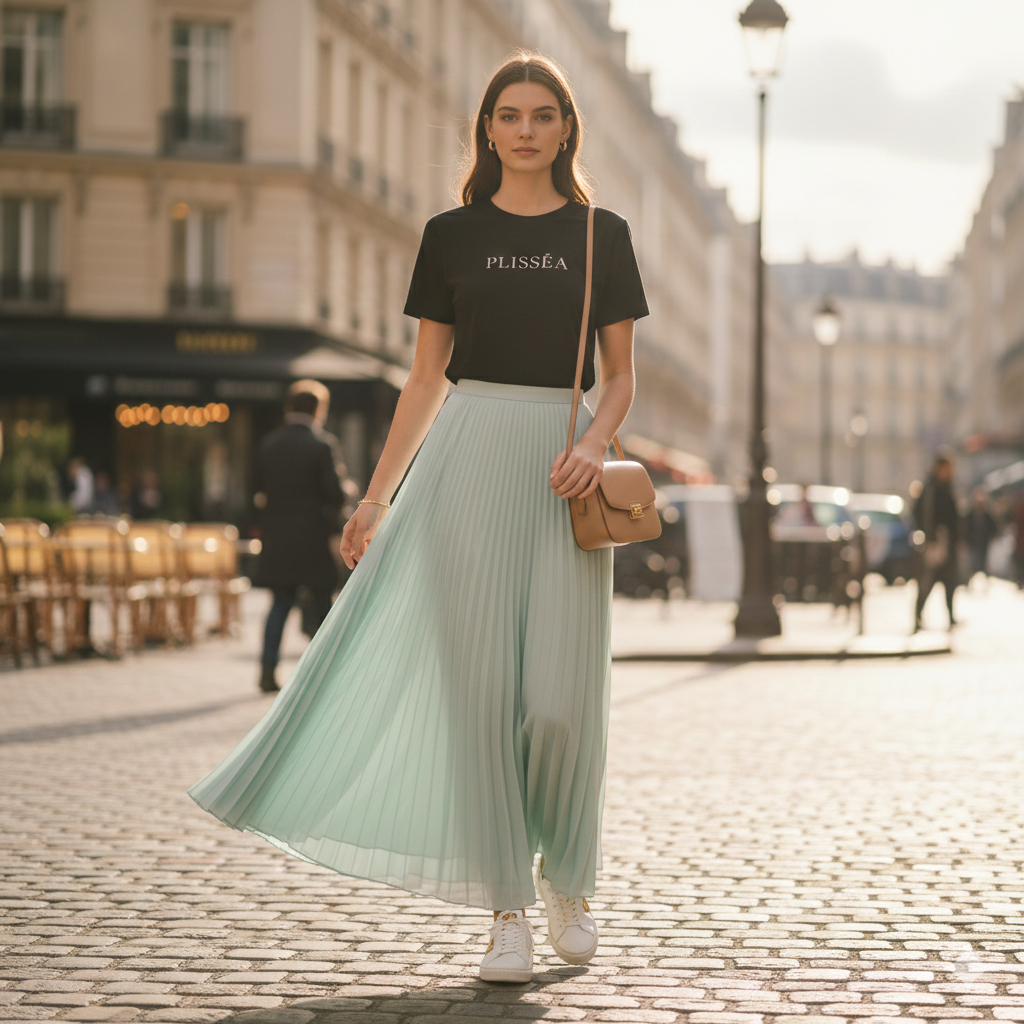 Des jupes plissées intemporelles aux vêtements plissés féminins, PLISSÉA incarne une vision du style à la fois moderne, maîtrisée et durable.
