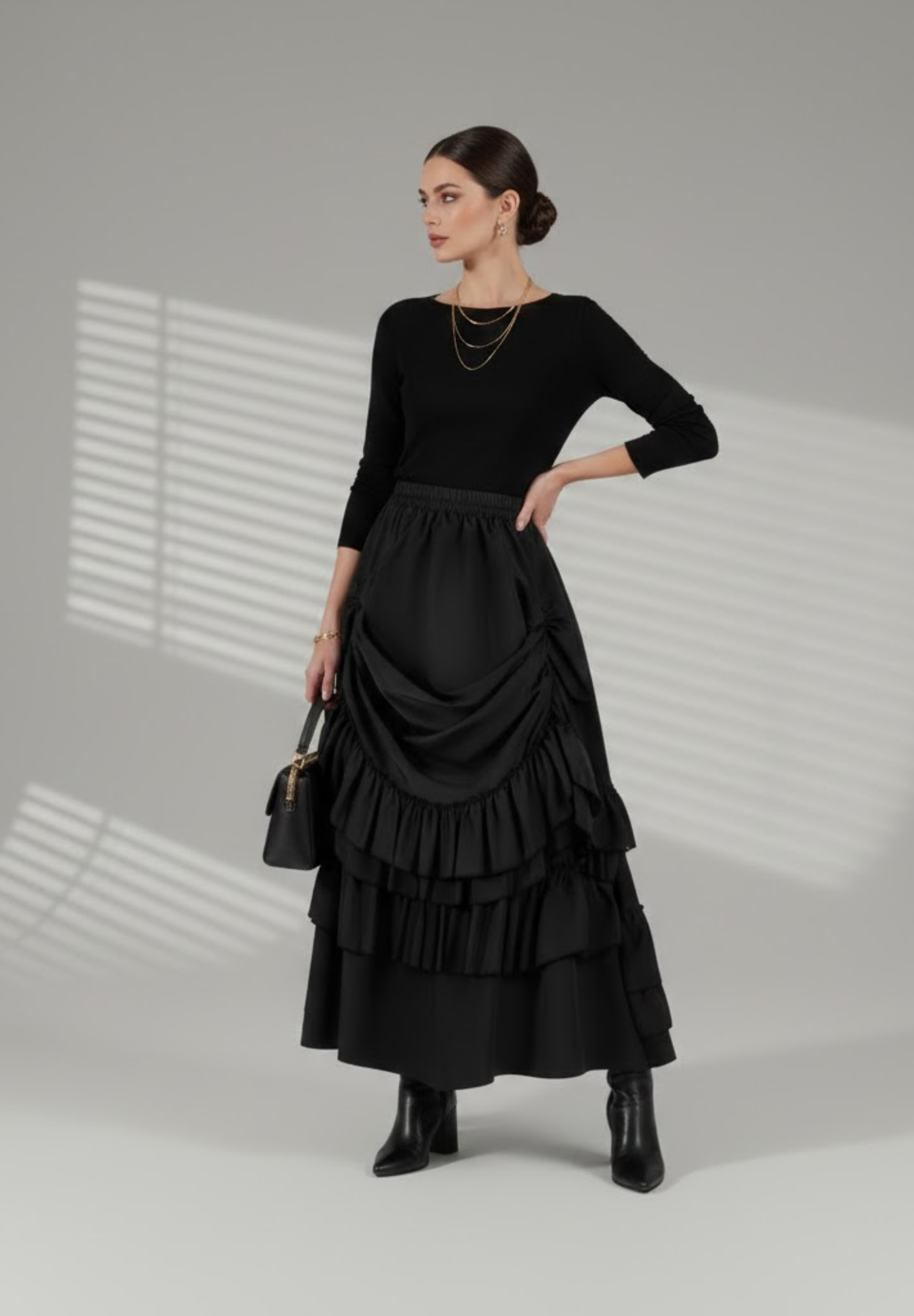 Chic et résolument féminine, la jupe crayon taille haute plissée est la pièce parfaite pour allier élégance et modernité. Sa taille haute met en valeur la silhouette tandis que le plissé apporte du mouvement et une touche raffinée. Avec sa coupe inspirée de la ligne A-line, elle épouse les formes avec subtilité et s’adapte aussi bien aux looks professionnels qu’aux tenues plus habillées.