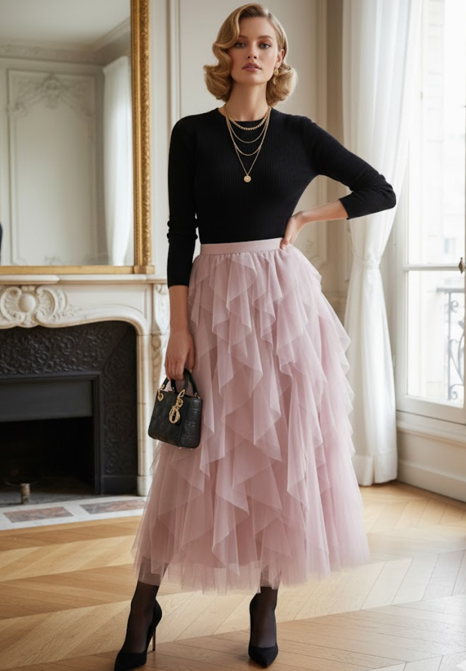 La jupe plissée taille haute est la pièce parfaite pour sublimer la silhouette avec élégance et légèreté. Sa taille haute met naturellement en valeur la taille, tandis que sa silhouette plissée apporte mouvement, fluidité et raffinement à chaque pas.